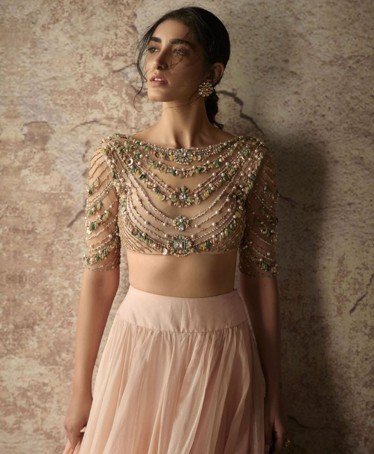 If you’re a bride who loves pastel shades, this blouse is just for you. It features a stylish boat neck design on both front and back, with trendy drape detailing in the front.