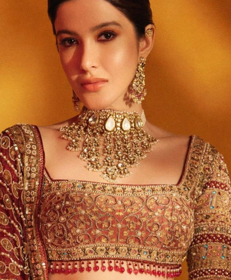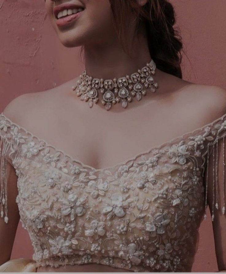 Who doesn’t enjoy a bit of playful style? This blouse features pearl tassels — perfect for brides who want a mix of tradition and fun.