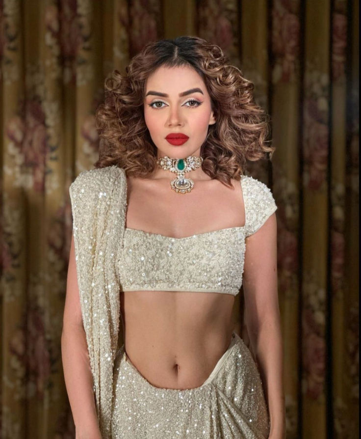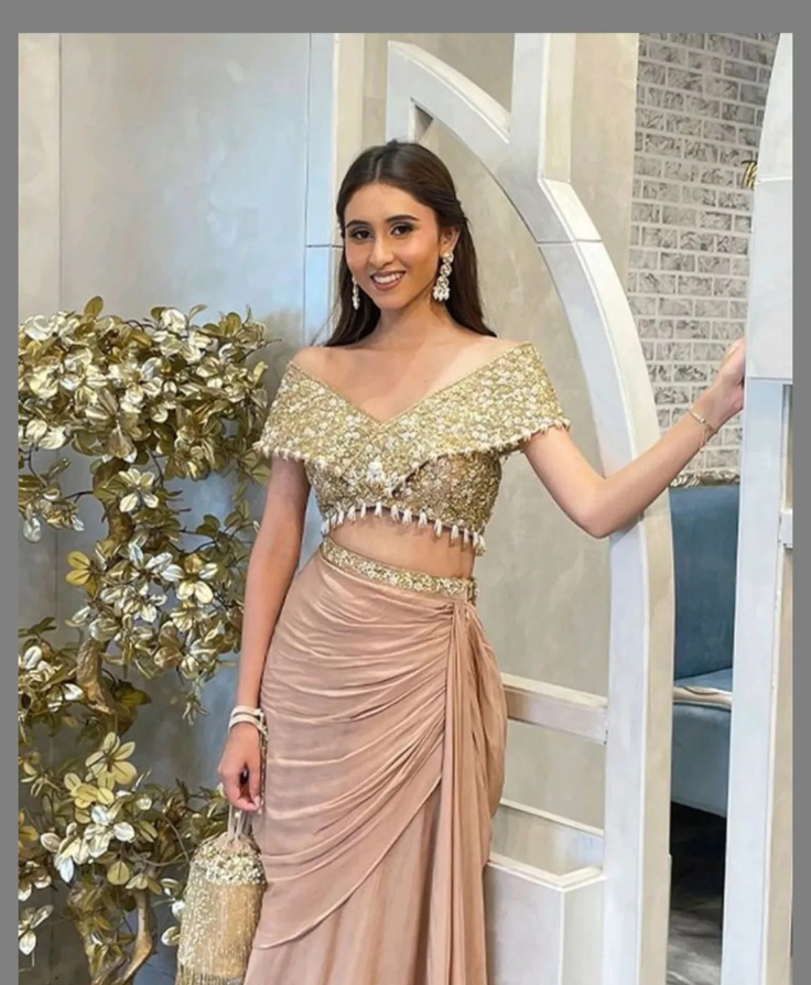 Not all sequin blouses are flashy. This one keeps it elegant with a simple boat neck – perfect for a stylish reception or a modern court wedding look.