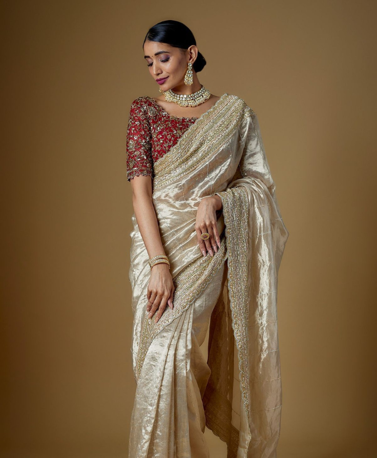 This rectangular boat neck blouse is neat and stylish. Its clean lines and touch of shine make it perfect for modern brides who love a simple look.