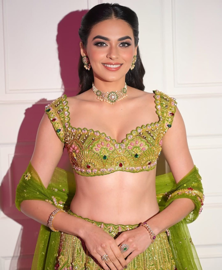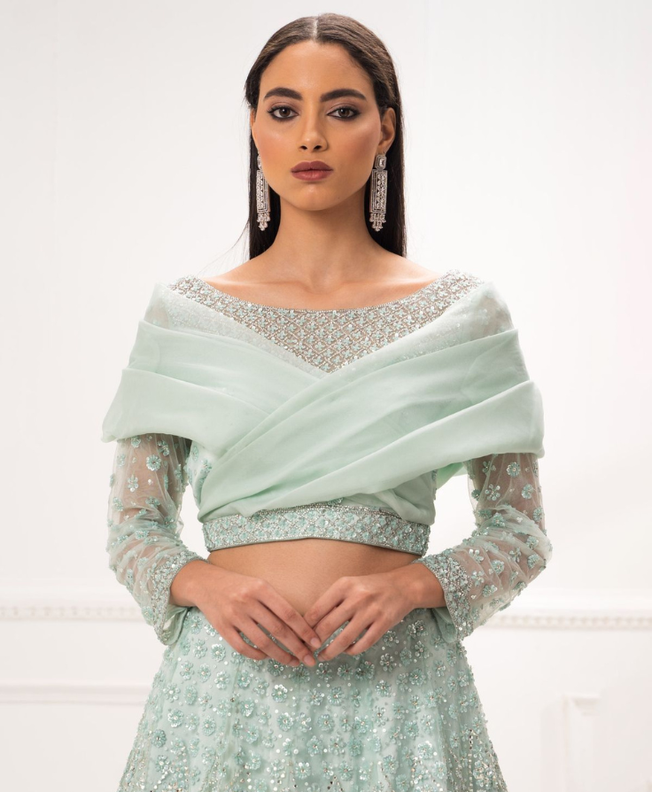 This blouse gives off cool, modern vibes! The lime green color, bralette style, and boat neck design make it perfect for a beachside mehendi or a fun haldi by the pool.