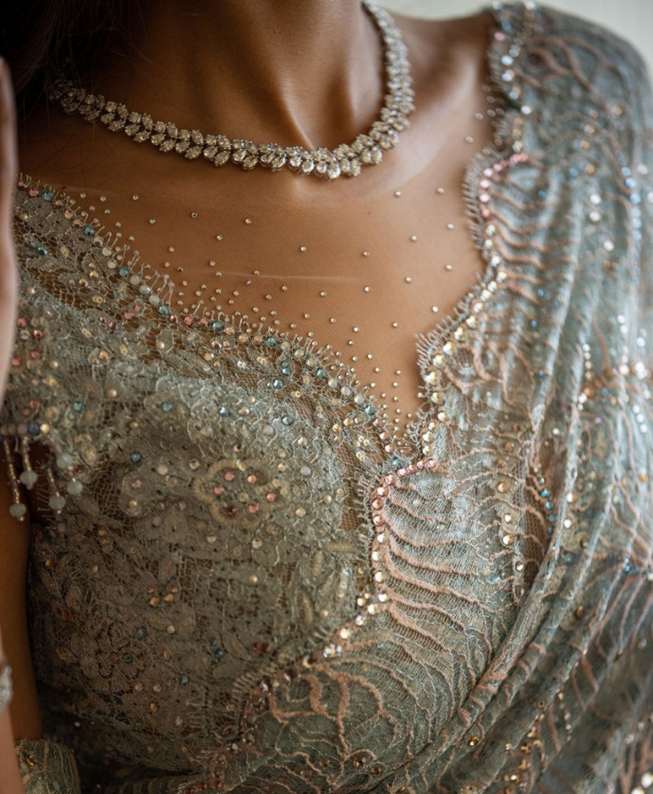 Stunning Grey Blouse Neck Designs With Sheer Detailing