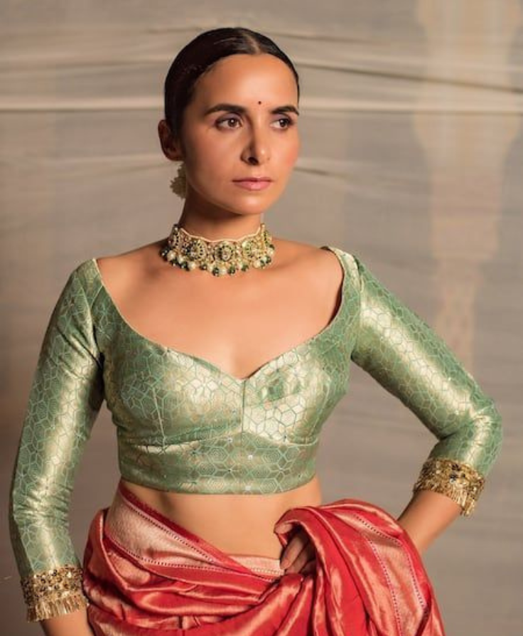 Red and boat neck is a timeless combo. Match it with a gold silk saree, bold lipstick, and your mom’s traditional jewellery for a classic look.