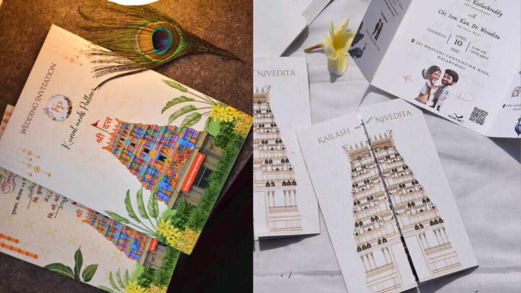 For weddings that follow strong traditions, these cards give respect to sacred temple designs. The style is inspired by the pillars and shapes of Indian temples. Many cards include symbols like Kalash, diyas, and simple Sanskrit shlokas. These invitations are very popular for traditional Hindu weddings and beautifully show your cultural roots and values.