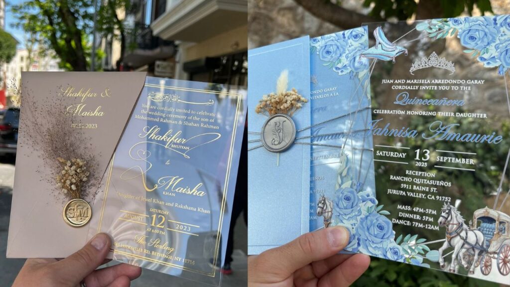 If you like a modern and stylish look, acrylic invitations are a great choice. These invites are printed on clear, high-quality sheets that look like glass. The transparent design with sharp gold foil lettering gives them a rich and elegant feel. It is a perfect option for couples who want a bold and modern style for their wedding invitation.