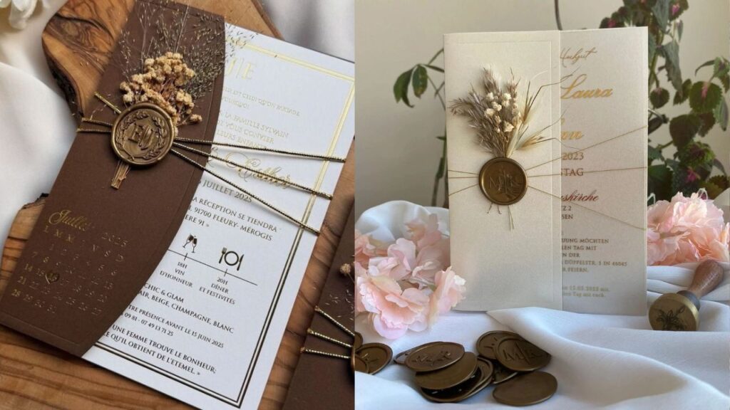 Wax seal invitations have a very romantic and classic feel. These cards often use textured handmade paper with soft silk ribbons. A custom wax stamp with the couple’s initials is placed on the envelope or card. When guests open it, the wax seal gives a special and personal touch, creating a timeless and elegant wedding invitation style.