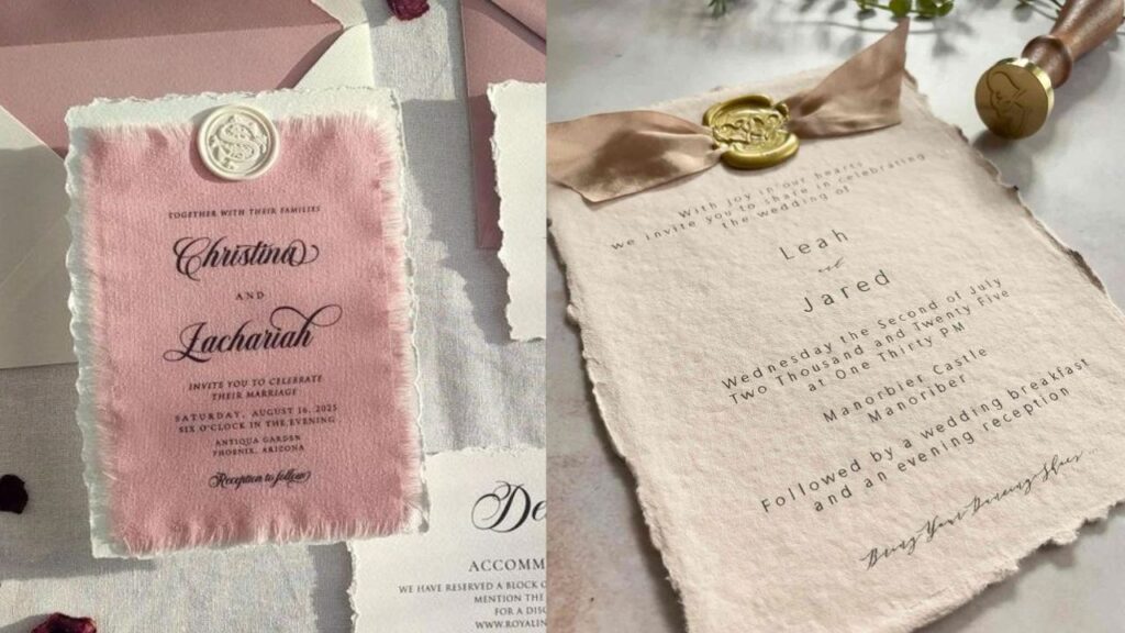 For couples who love nature or prefer eco-friendly ideas, rustic invitations are a great option. These cards use textured handmade paper that gives a natural and earthy feel. When decorated with dried flowers, simple twine, and Kraft paper envelopes, they create a soft and beautiful look. It is a perfect way to give your wedding a simple and relaxed feel from the start.