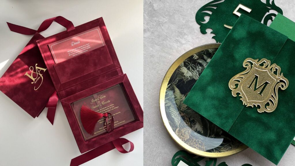 If you want something different from paper cards, fabric invitations are a great luxury option. These invites are made with materials like silk or fine cloth, which makes them feel special and long-lasting. Many designs include embroidered names and beautiful zari work, giving the invitation a rich and traditional look while also feeling very elegant.