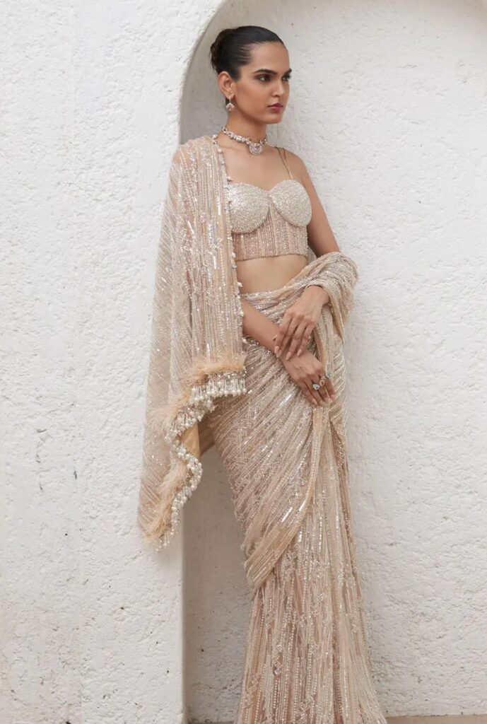 A corset blouse can beautifully enhance the look of a saree by adding structure and style. If you’re a bride-to-be and want to add a touch of glamour to your saree look, a corset blouse is a great choice. It can make your outfit look modern yet elegant for any wedding function.