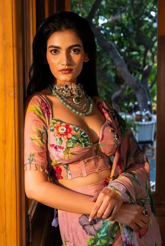 - If your corset blouse is heavily embroidered, pair it with a simple saree to make the blouse the main highlight.