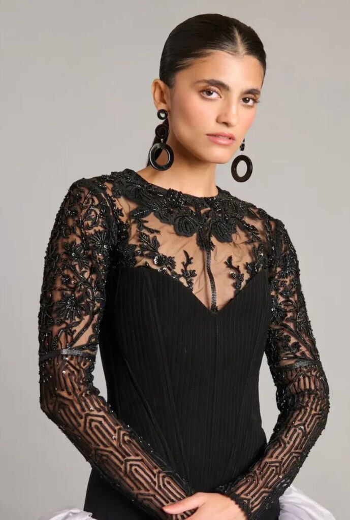 - Embroidery in gold, silver, gunmetal, or deep black tones enhances the blouse and adds extra texture and elegance.