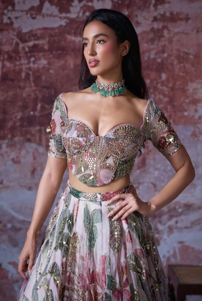 This hand-embroidered corset lehenga blouse in a tropical print gives a modern princess vibe. The plunging sweetheart neckline and structured fit add a dreamy, elegant touch.