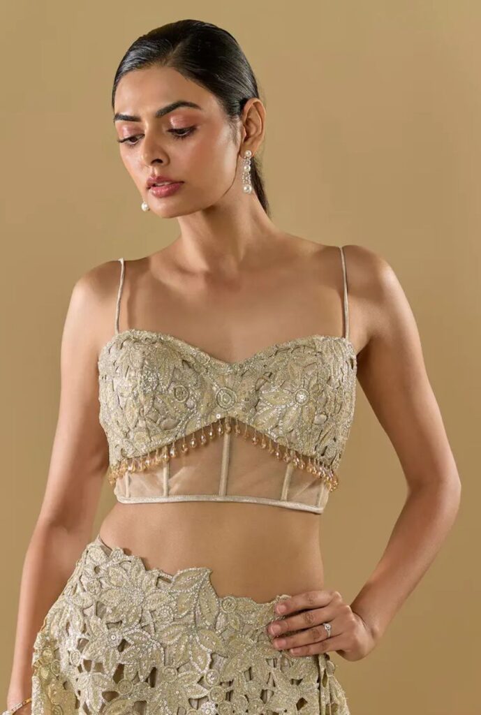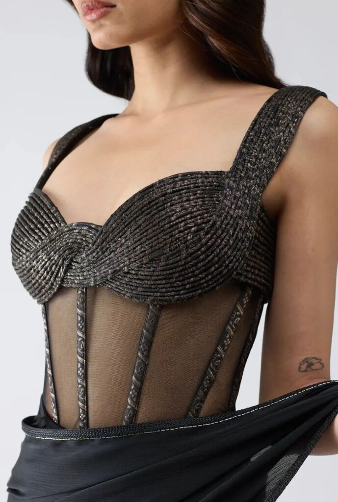 The corset blouse takes inspiration from European fashion, where corsets became popular between the 16th and 20th centuries. Back then, women from royal families in France and England wore corsets to shape their waist and give their body a defined look. Over time, this trend reached India and turned into a modern fashion piece known as the corset blouse. Today, it’s a favorite choice for bridal, wedding, and designer wear, giving a perfect mix of traditional and modern style.