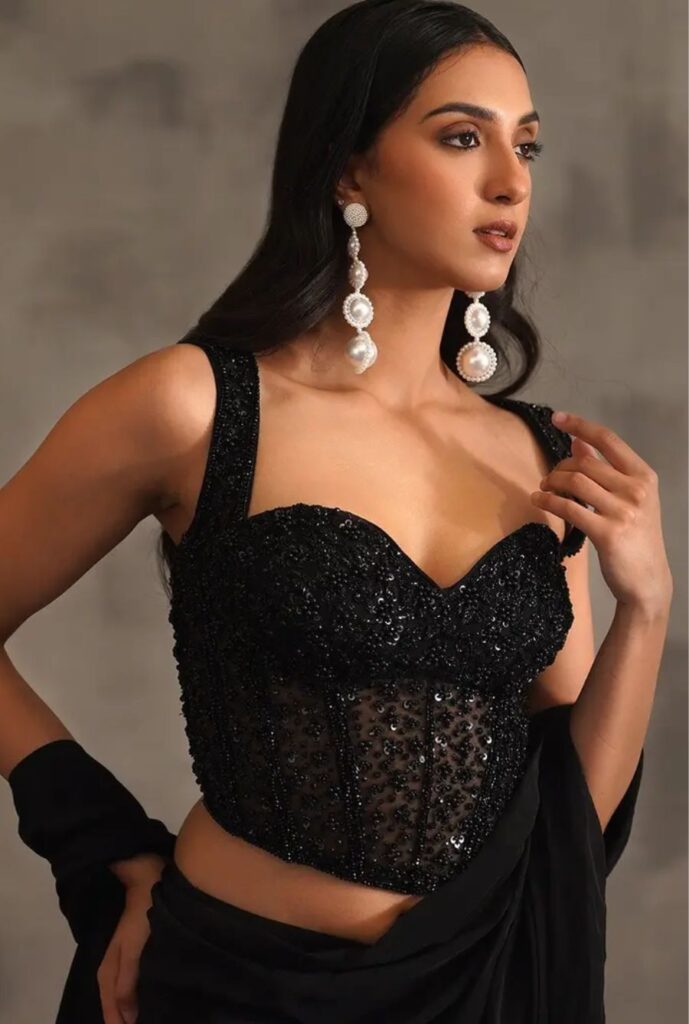 Black corset blouses are bold, stylish, and add a smart, chic vibe to any outfit. Whether you’re wearing a saree or a black lehenga for your wedding reception, a black corset blouse is a perfect choice for a cocktail or party-ready look. While black may seem dark or gothic at first, the right embroidery and embellishments can make it look elegant, classy, and ideal for Indo-western styles.