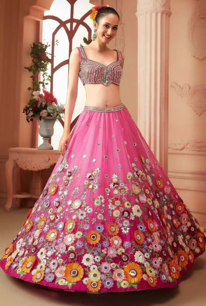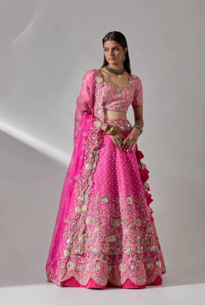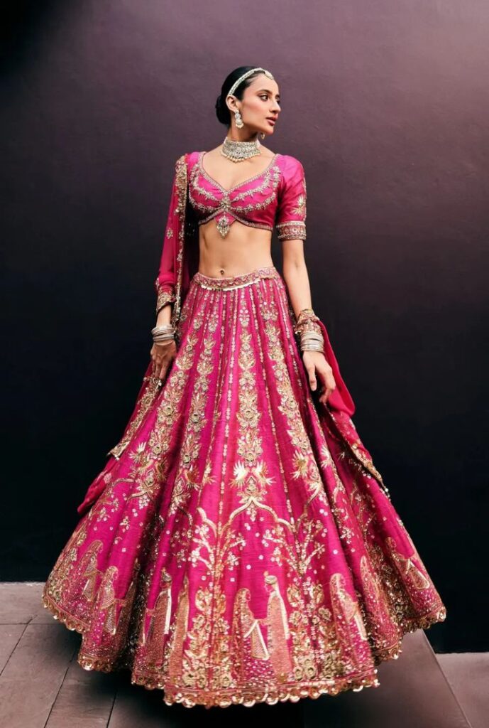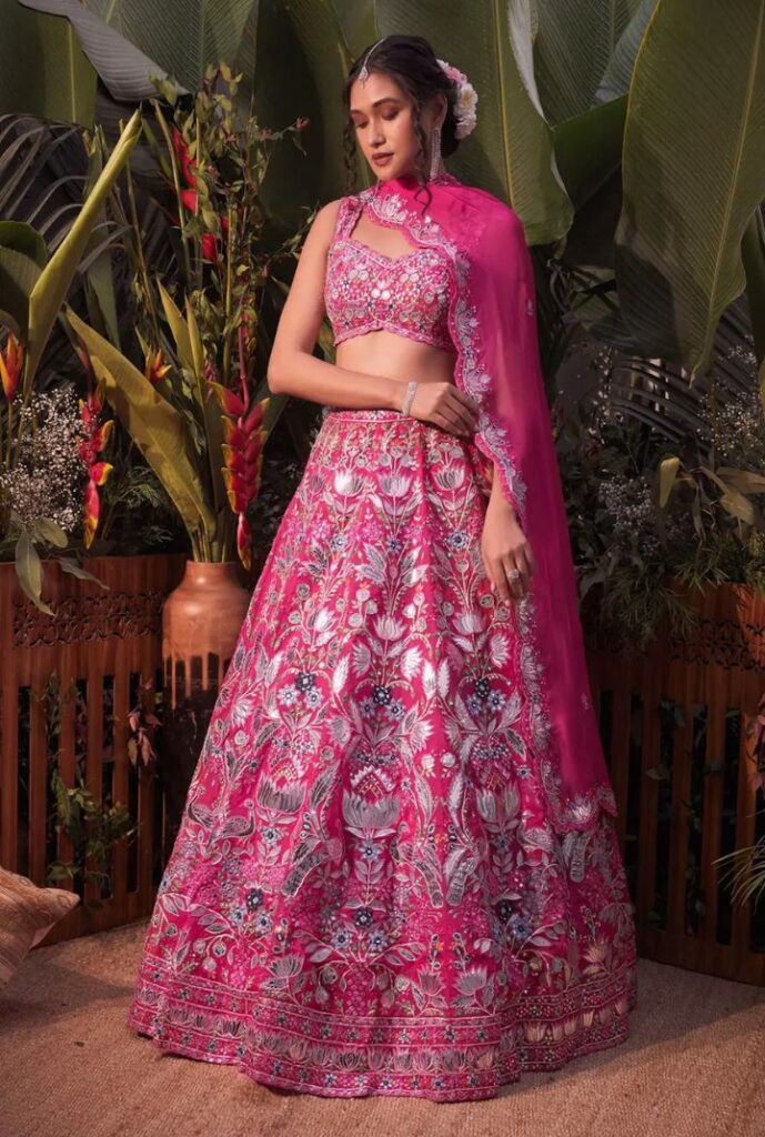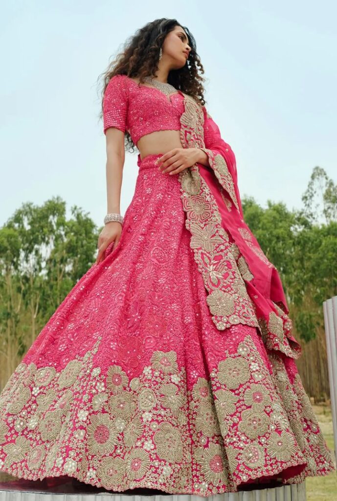 - Heavy embroidery like Banarasi threadwork, Gota Patti, zari, and sequins makes hot pink lehengas stand out.