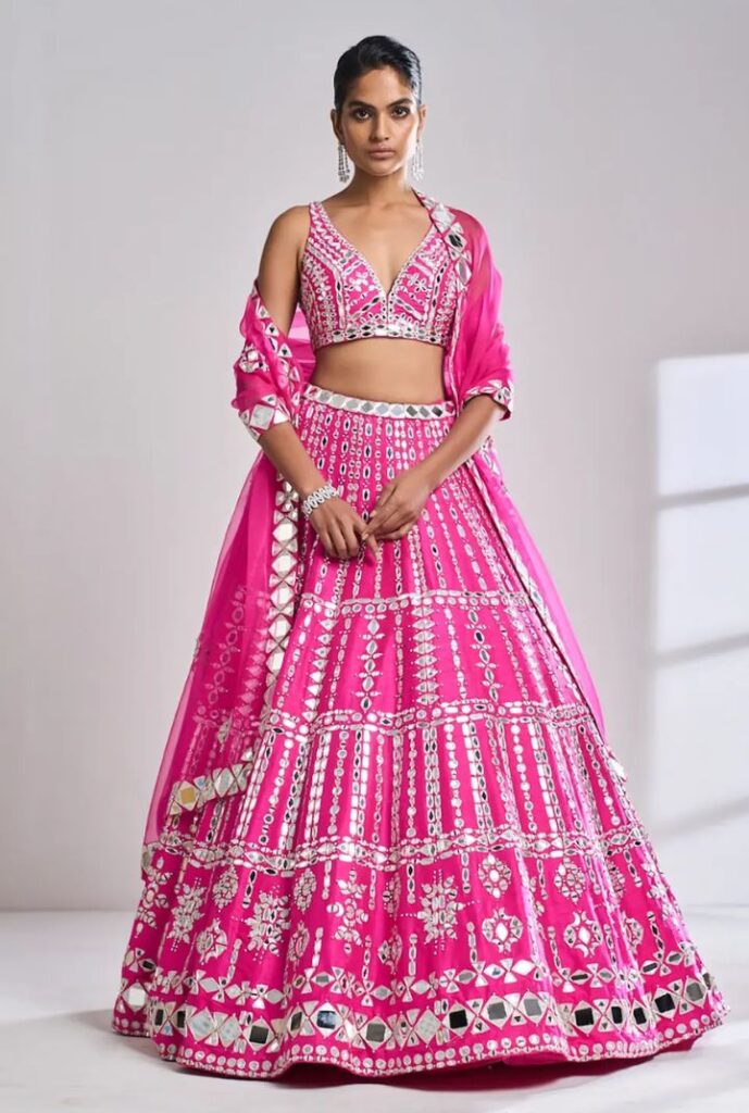 - If full dark pink feels too much, try a light pink lehenga with dark pink embroidery or embellishments.