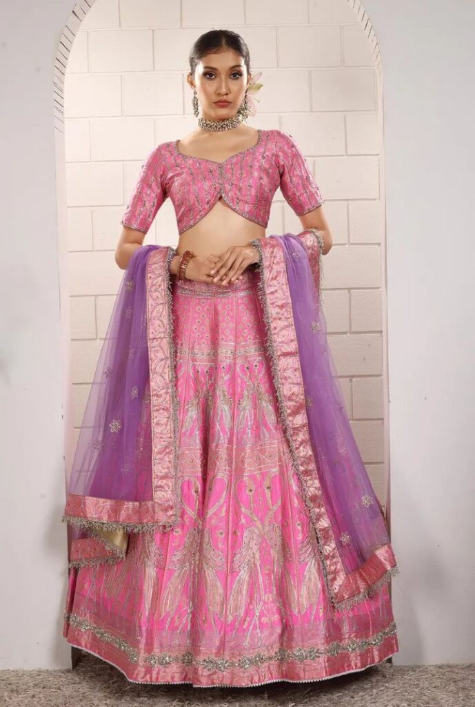 Pink Silk Bridal Banarasi Lehenga Set with Zari Neckline