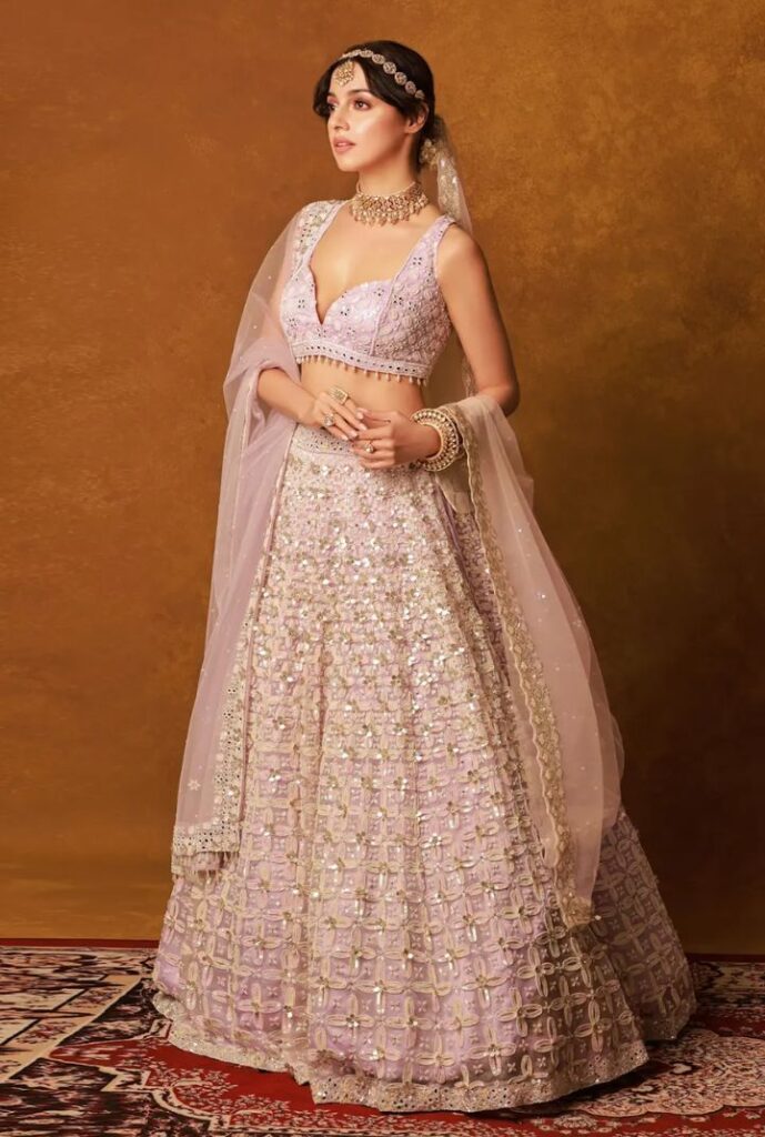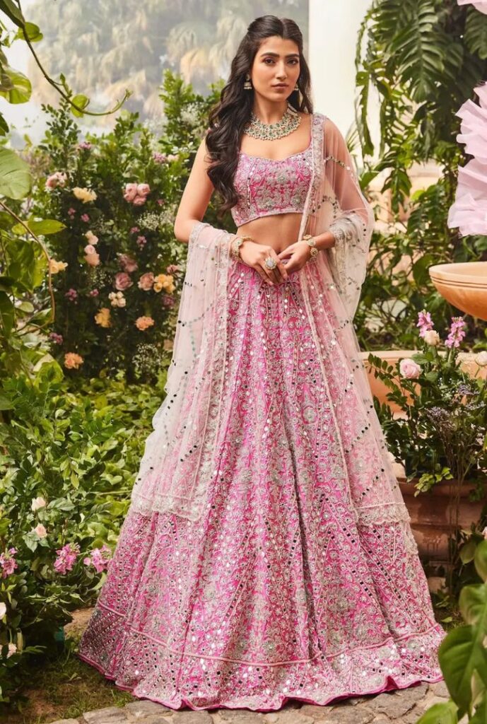 - Silver, grey, and different shades of pink work best for sequins, crystals, and threadwork on baby pink lehengas.