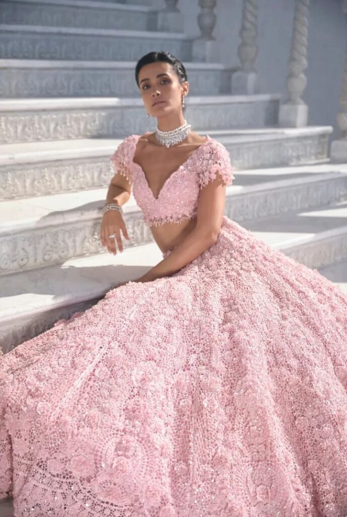 Baby Pink Lehenga with V Neckline and 3D Floral Embroidery