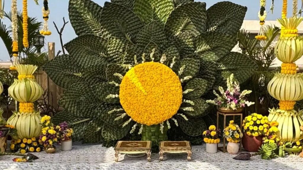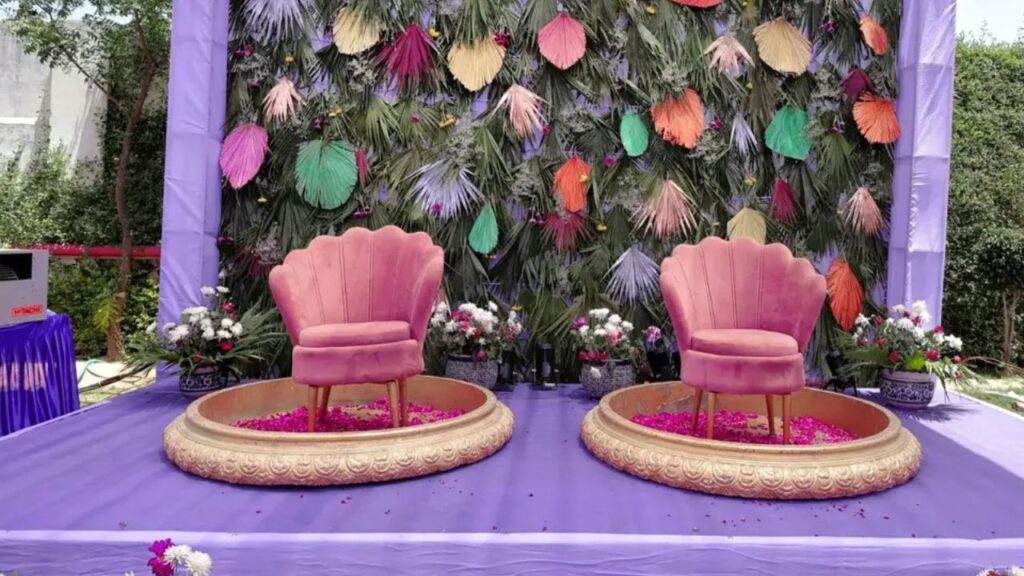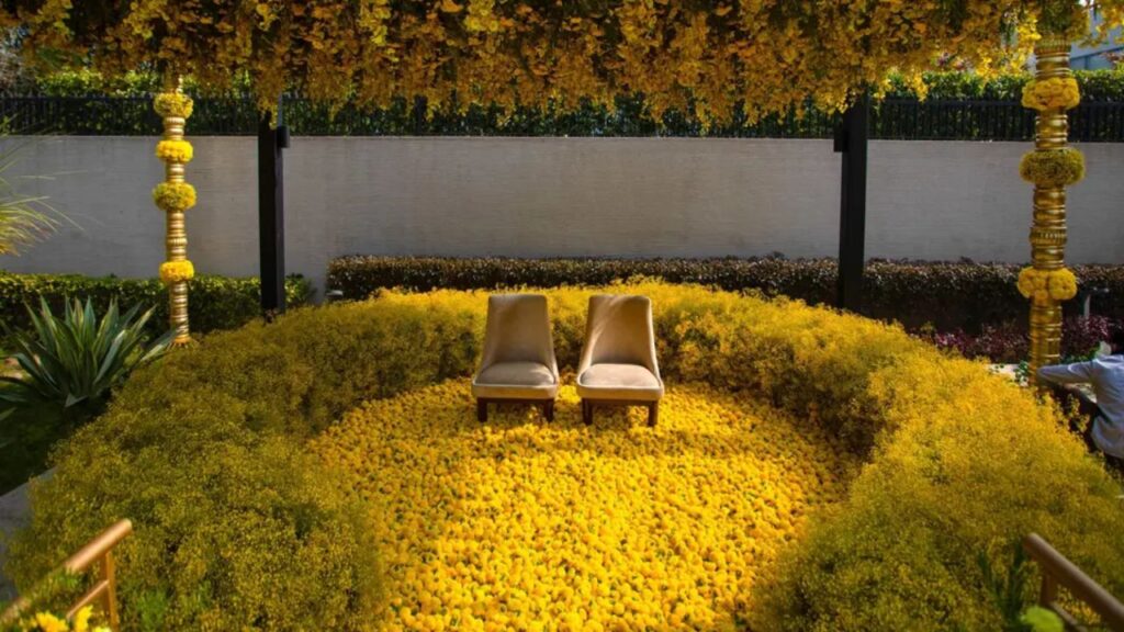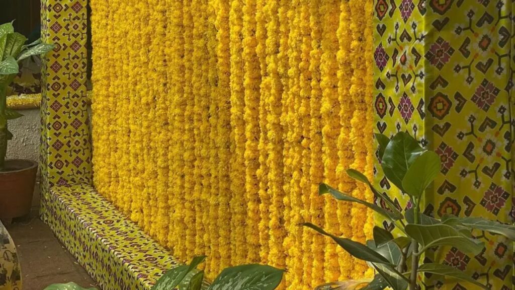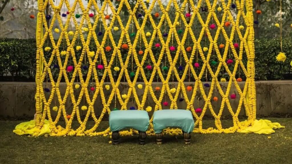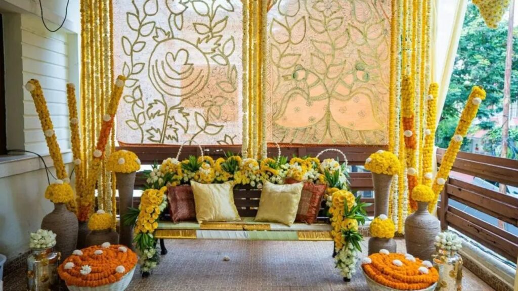 Even with limited space at home, you can easily design stunning Haldi flower decoration setups indoors!
