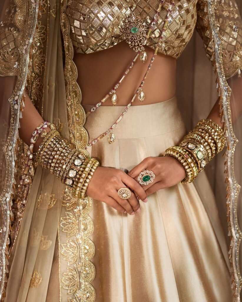 It is just like the name suggests. Instead of a fabric dupatta, it is made with delicate chains, beads, and jeweled designs that rest beautifully on the shoulders and chest. It looks more like body jewelry than a normal dupatta. It is light to wear, stylish, and eye-catching. Some designs even come with pearls and crystals.