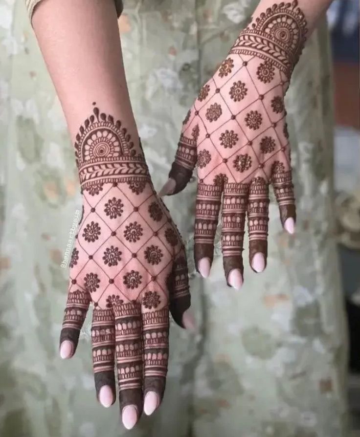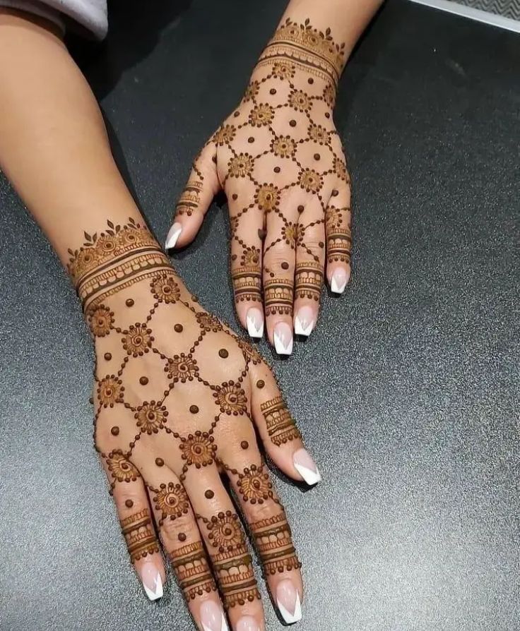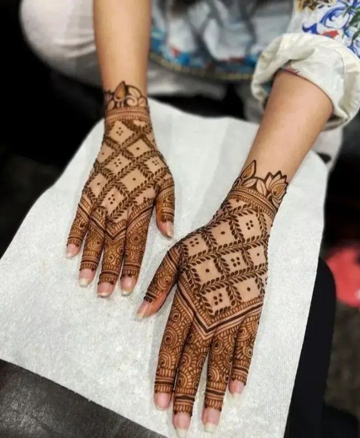 This design is a stunning mix of sophistication and artistry. Featuring traditional lattice patterns, it strikes the perfect balance between symmetry and creativity. To make it even more attractive, mehndi artists often add shaded flowers, leafy trails, or delicate dotted accents around the latticework, giving the design depth and a truly eye-catching appeal.