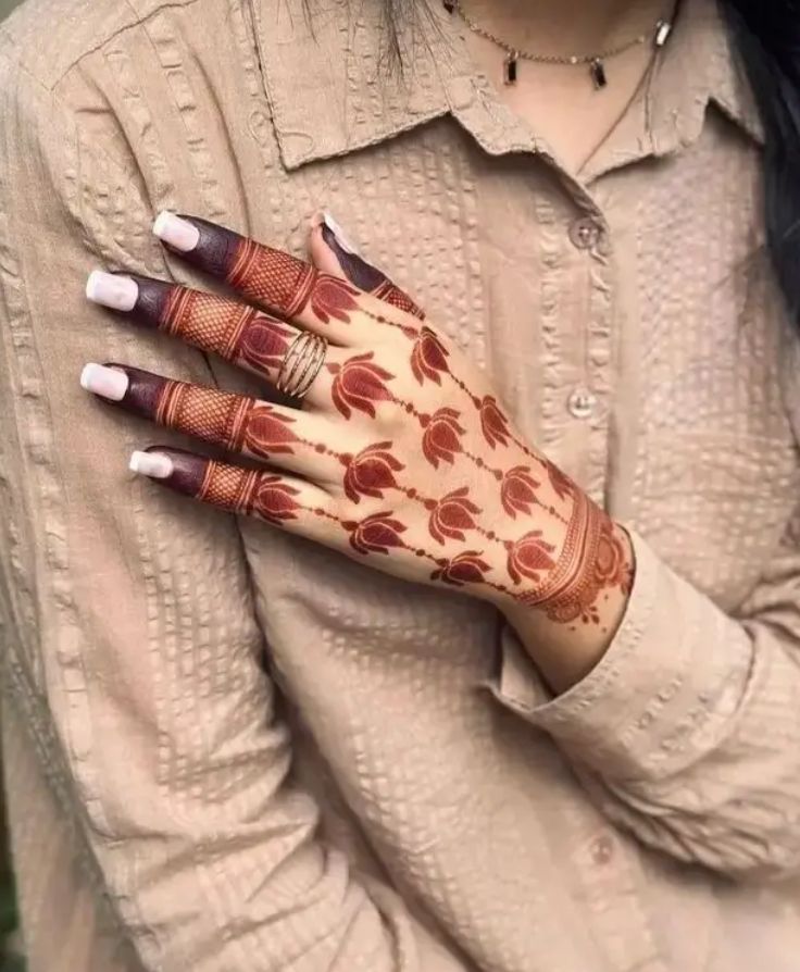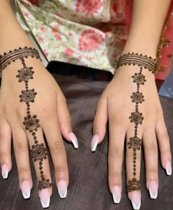 This design is a romantic and decorative style inspired by the traditional Indian hand jewelry, Haath Phool. These elegant backhand mehndi patterns give the charm of hand accessories without wearing actual jewelry, making them perfect for intimate celebrations. Popular among brides, bridesmaids, and festive occasions, this style is both chic and graceful. The floral motifs add a delicate, feminine touch, while the Haath Phool layout brings a modern, jewelry-inspired elegance to the design.