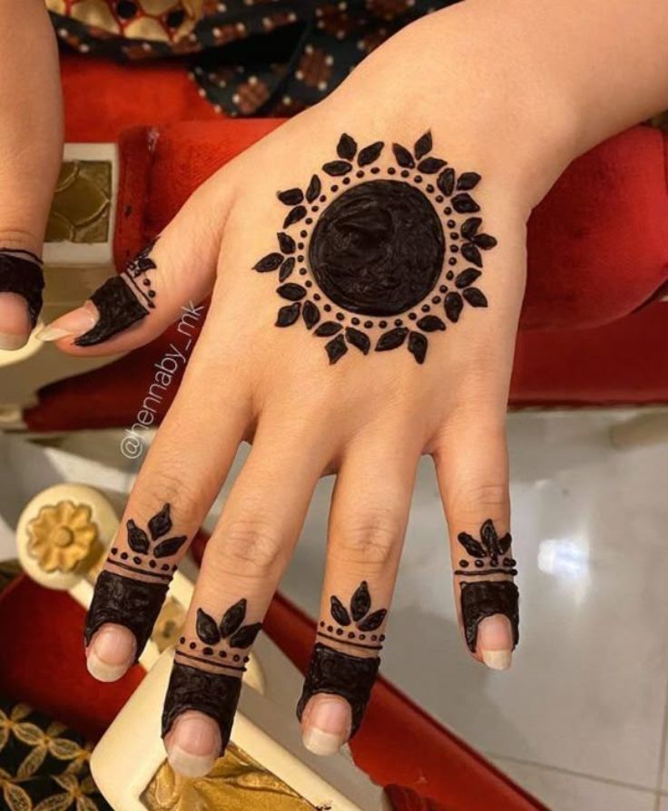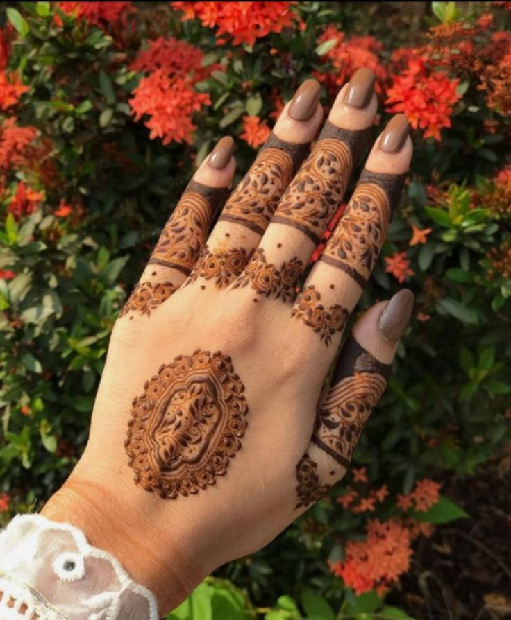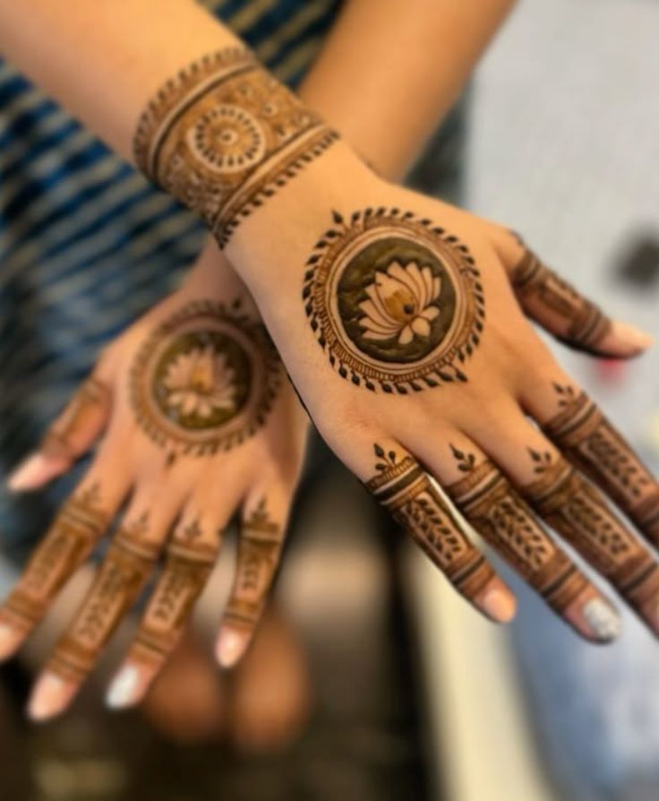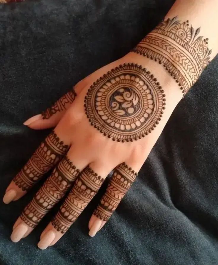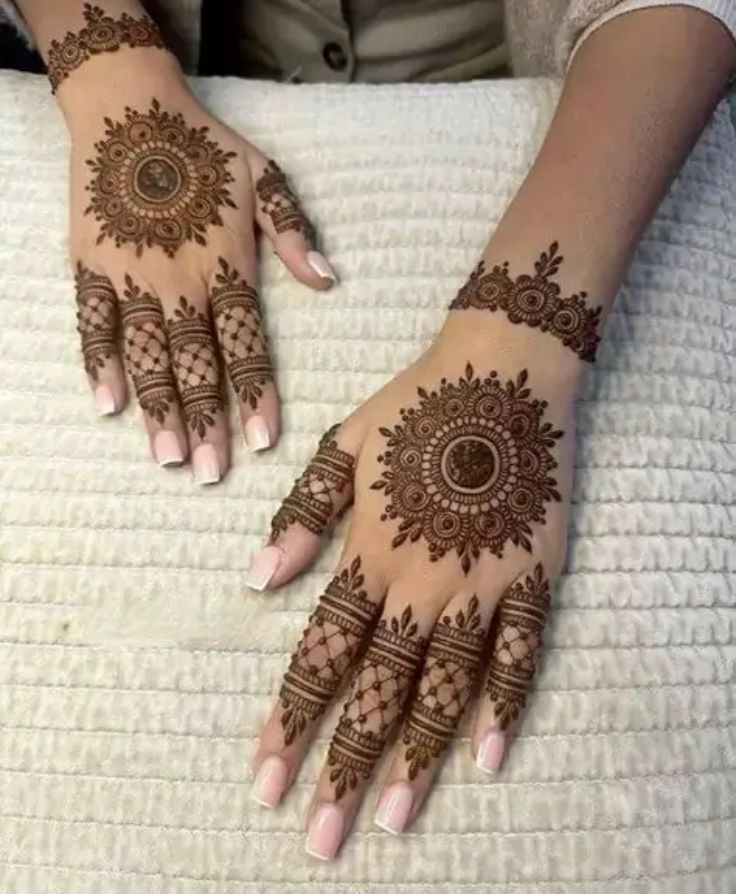 A classic and timeless choice, the Mandala backhand mehndi design exudes symmetry, balance, and a touch of spiritual elegance. The design places a perfectly round mandala at the center of the backhand, making it the focal point for a harmonious and captivating look. To elevate the design, delicate lines, floral trails, or leafy patterns can extend onto the fingers, while the wrist can feature a simple band or cuff-style motif for added charm.