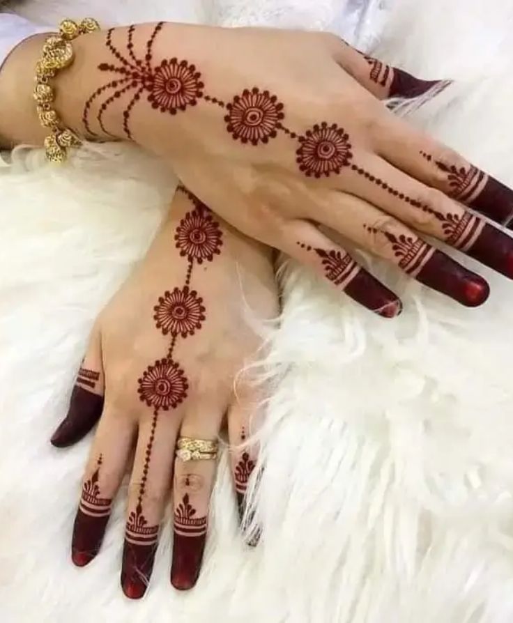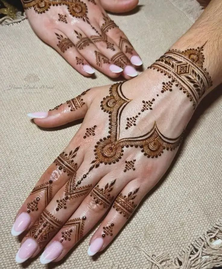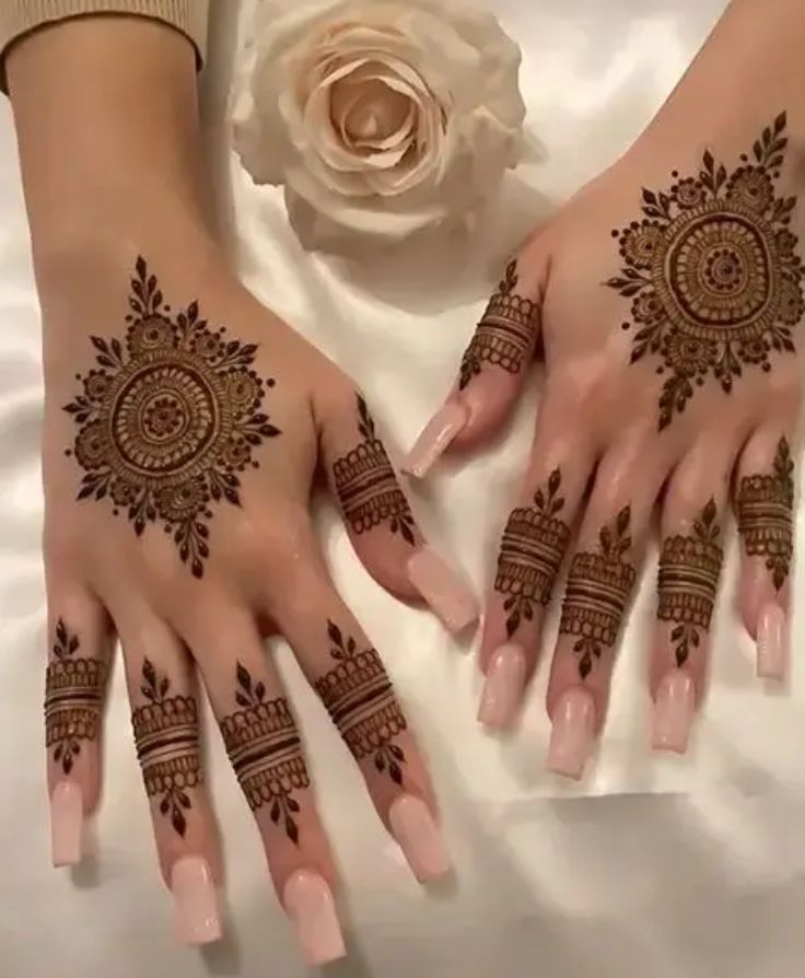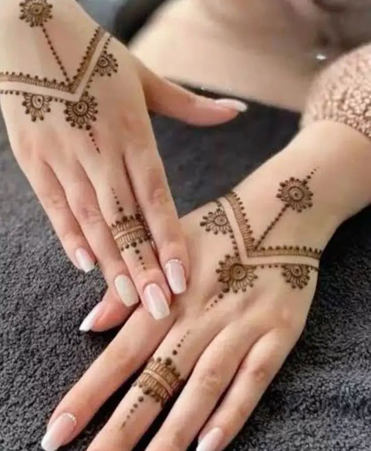 Minimalist backhand mehndi designs embrace subtlety and elegance. Focused on clean lines, delicate motifs, and smart use of negative space, these designs enhance your natural beauty with simplicity and style. Some patterns feature a small mandala at the center with minimal surrounding details, while others emphasize the fingers with sleek lines and subtle accents, offering a chic and understated look.