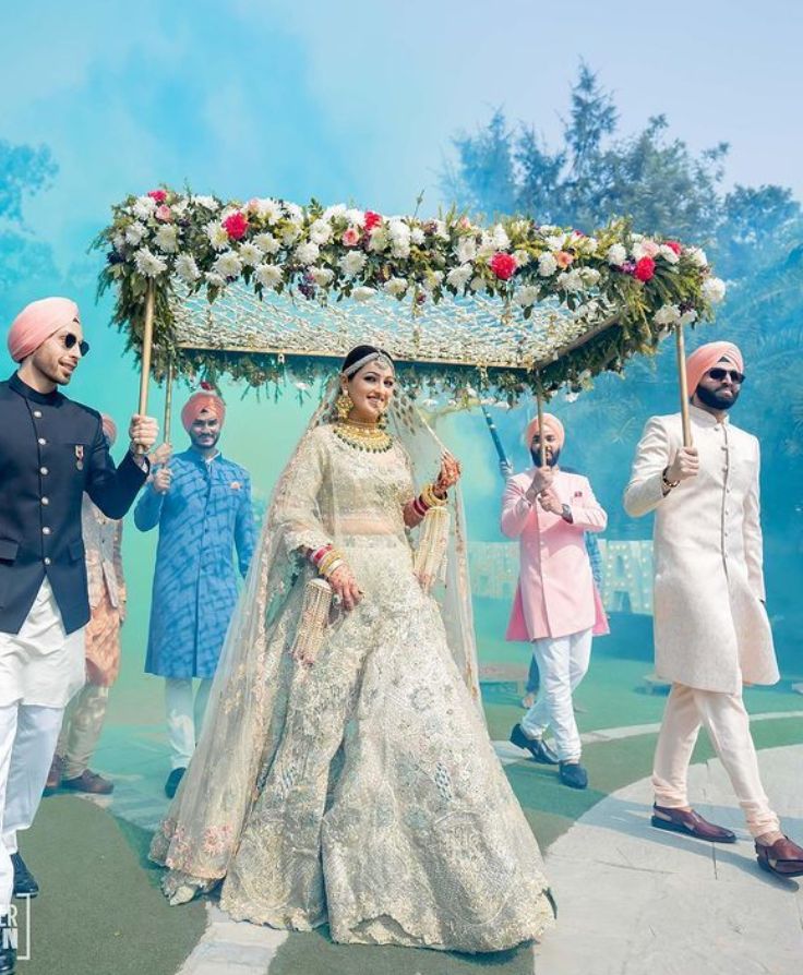 Want a lively and fun entry? Choose a bride entry with dhol. The beats fill the air with energy, and your guests will start clapping, dancing, and cheering for you. It’s full of joy and makes you the star of the moment.