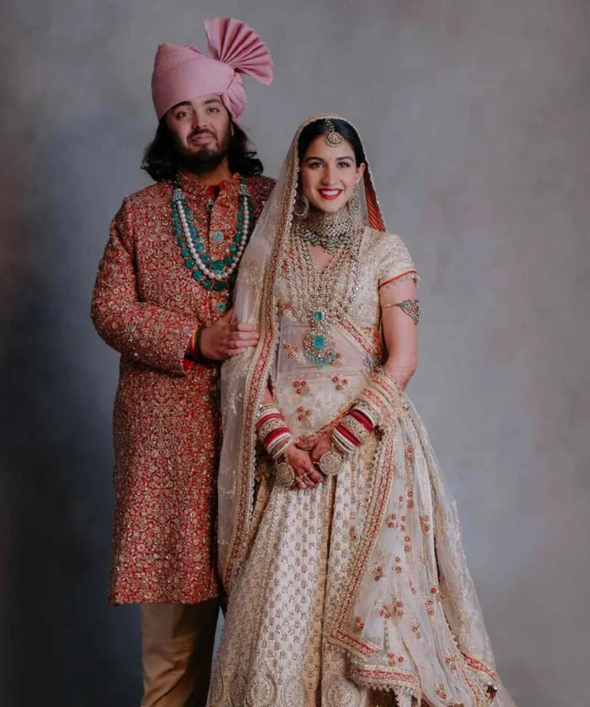 Couples who love contrasting yet complementing wedding looks can take inspiration from Anant and Radhika Ambani’s ensembles. Anant’s gold-embroidered royal red sherwani with beige pants beautifully balanced Radhika’s off-white traditional Gujarati Panetar lehenga.