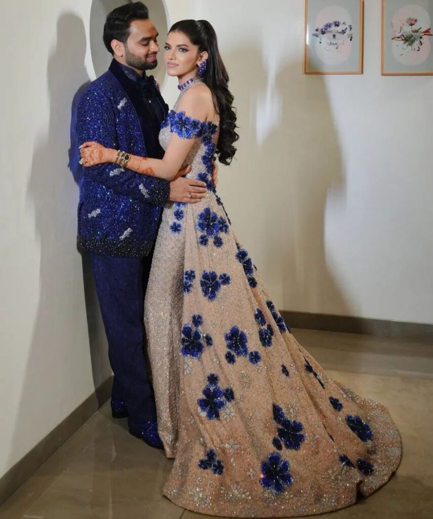 Steal the spotlight with this dazzling colour-coordinated look, perfect for cocktail nights to reception celebrations. The groom’s blue-toned outfit is beautifully echoed through 3D embellishments on the bride’s beige dress, creating a stylish and balanced couple ensemble.