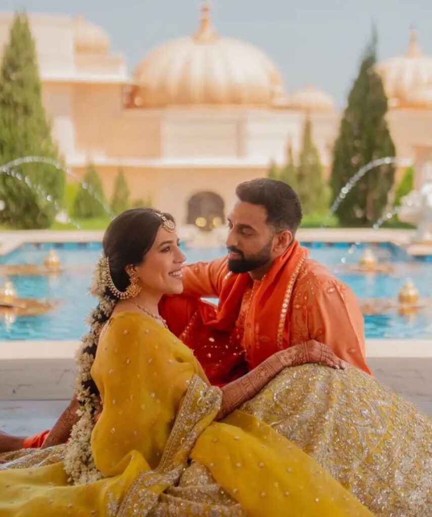 Stand out like two vibrant marigold blooms in these colour-coordinated outfits. The groom’s burnt orange kurta-pyjama with mirror work contrasts beautifully with the bride’s mustard yellow lehenga, adorned with delicate white and silver embroidery.