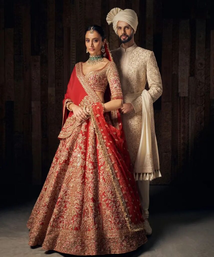 A favourite contrasting outfit choice among celebrities and trendsetting couples is the red and pearl white combination. In cultures where both colours are considered auspicious, a simple red lehenga for the bride paired with a pearl white bandh gala set for the groom creates a flawless wedding look.