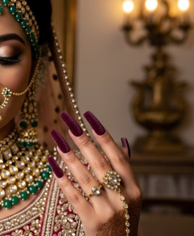 These unique finishes bring eye-catching beauty to bridal nail extensions using advanced techniques and professional-grade products found in premium salons like Peacock Salon. Velvet nails use fine flocking powder over gel polish to create a soft, fabric-like texture. Glass nails offer a crystal-clear, mirror-like shine through layered clear gels. Magnetic gels contain special particles that react to magnets, forming cat-eye effects or striking patterns. Each of these styles requires expert skill and precise timing to achieve flawless results.