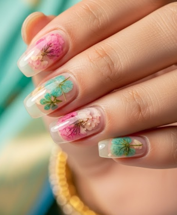 Bridal nail extensions with dried flowers embedded in the design offer a dreamy, romantic look—especially loved during spring and summer weddings. Real elements like baby’s breath, small rose petals, or fern leaves are carefully placed and sealed under clear layers, creating a beautiful 3D effect. Each nail turns out unique, with natural, organic patterns that can’t be duplicated. Soft pastel bases highlight the beauty of the flowers while keeping the overall look gentle and feminine—perfect for garden weddings or outdoor ceremonies.