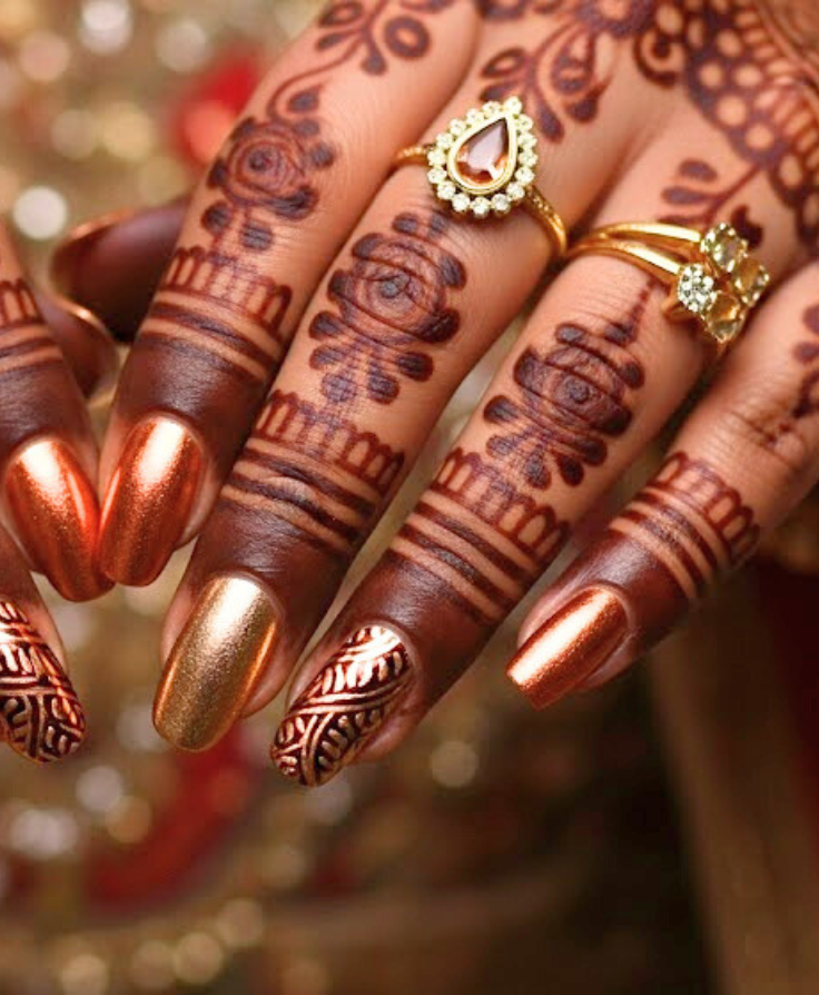 Mehndi-Inspired Nail Art with Metallic Finishes