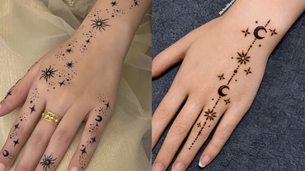 Never underestimate the power of a simple star. A clean star with a double outline and a cluster of tiny dots around it instantly looks refined and intentional. Great as a standalone motif on the back of the hand or repeated in a larger design.